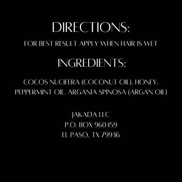 Apply a palm full of Conditioner and massage in scalp throughout hair shaft. Place shower cap on hair and let hair steam under heat or with hair dryer for 45 minutes. Then rinse thoroughly under warm water. For best results, use w/ Jakada Shampoo & Jakada Butter.